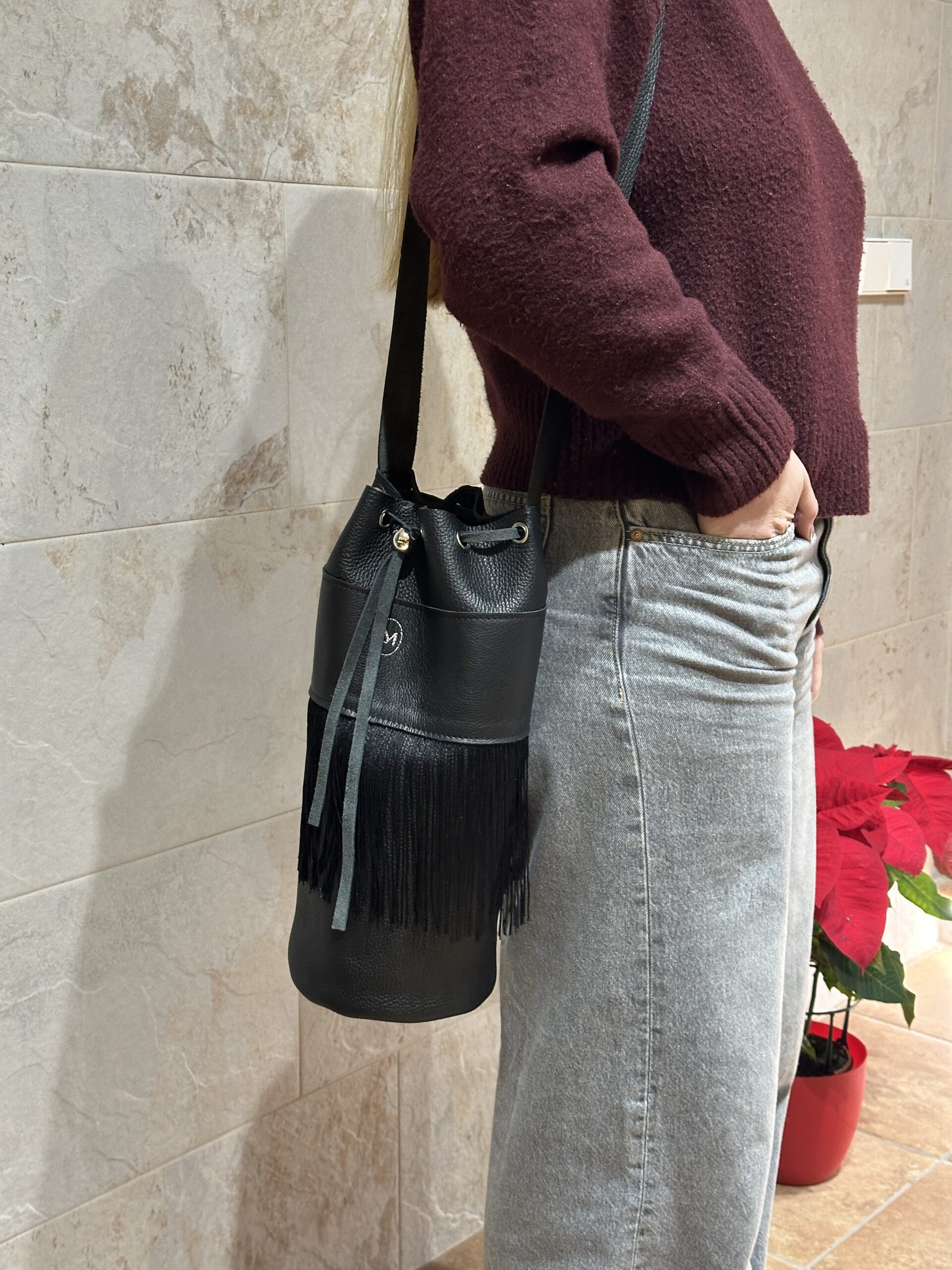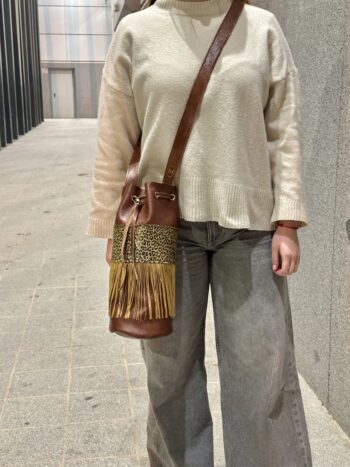 Su diseño tipo saco, acompañado de un cordón ajustable con herraje metálico y flecos largos artesanales, aporta movimiento y una personalidad única. Gracias a su tamaño XL, ofrece una capacidad superior sin perder ligereza ni comodidad, convirtiéndose en la compañera ideal para tu día a día, para viajar o para llevar todo lo esencial con estilo.