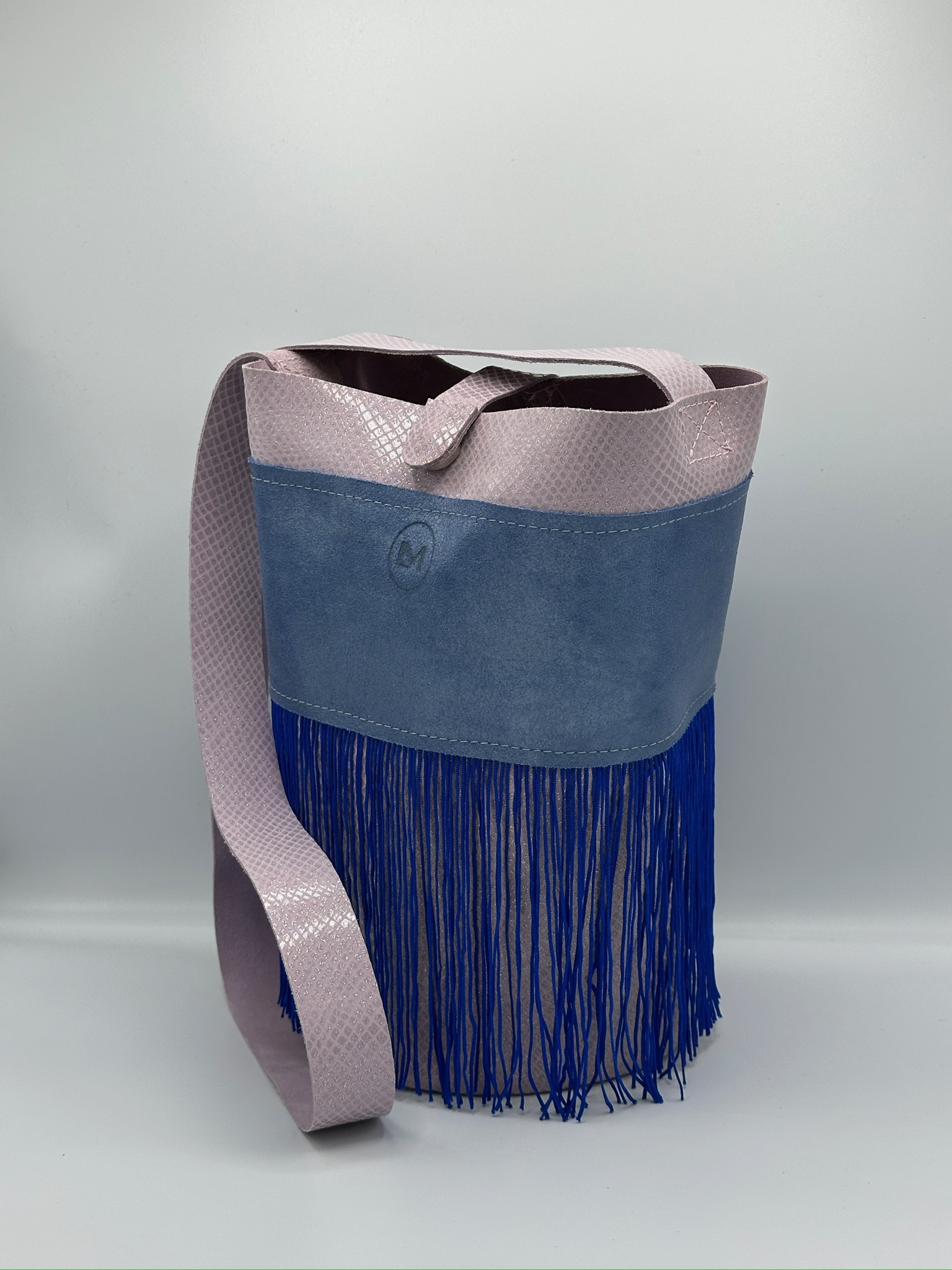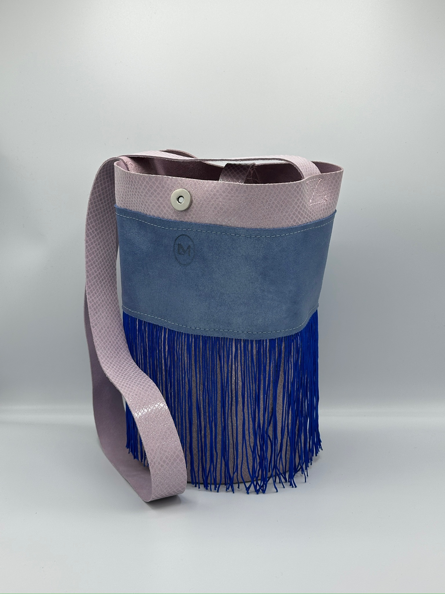 Su combinación de lila suave en la parte superior con textura efecto serpiente y un cuerpo en azul pastel evoca la calma del mar al atardecer. Los flecos largos en azul profundo aportan movimiento y carácter bohemio, en perfecta sintonía con el estilo boho chic.