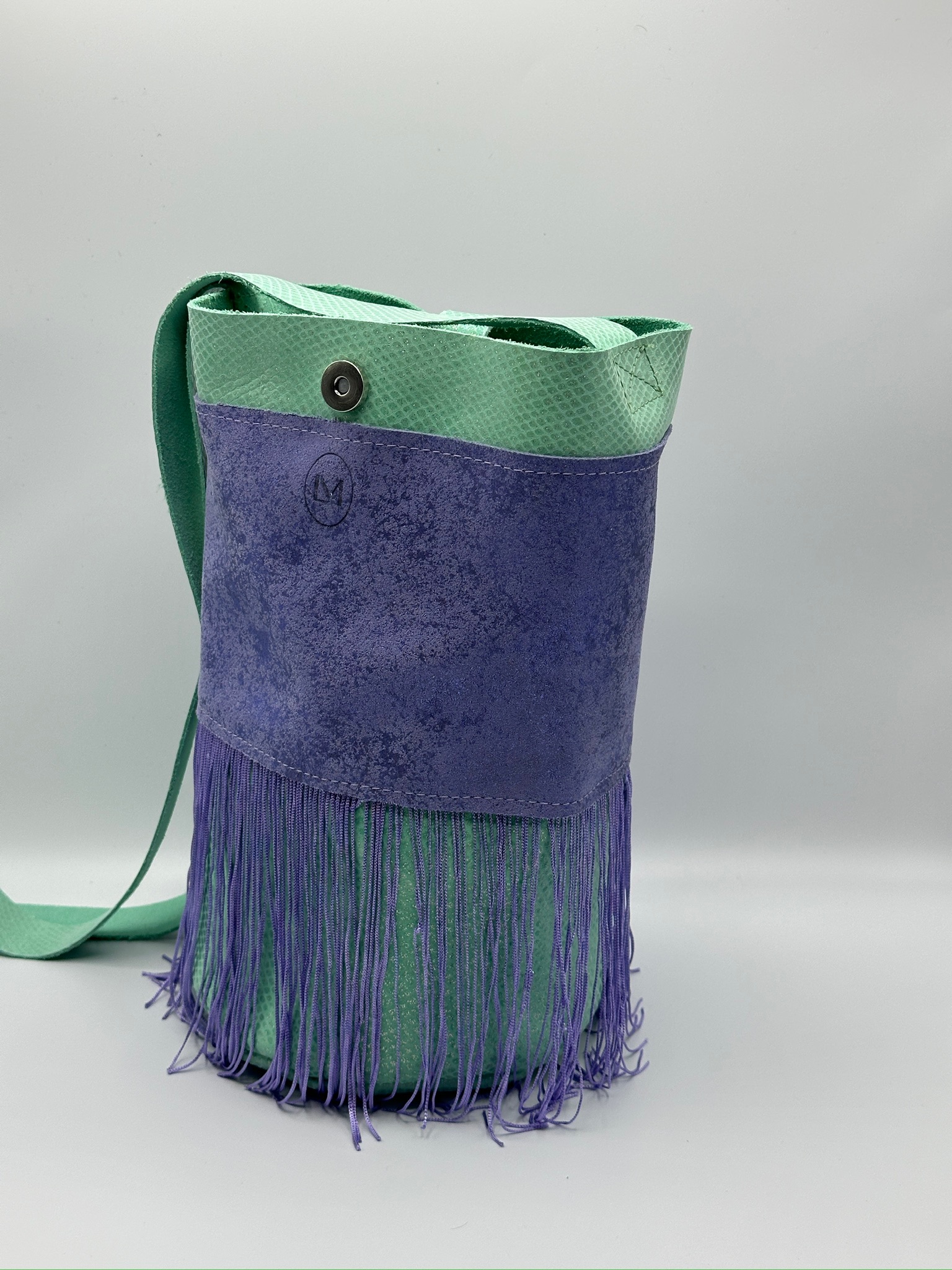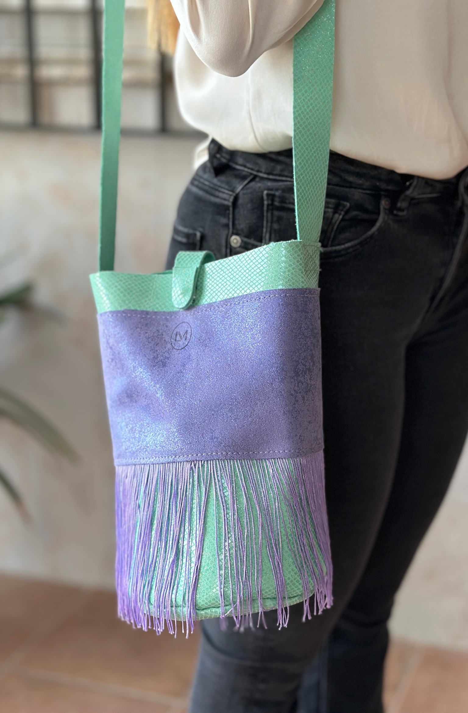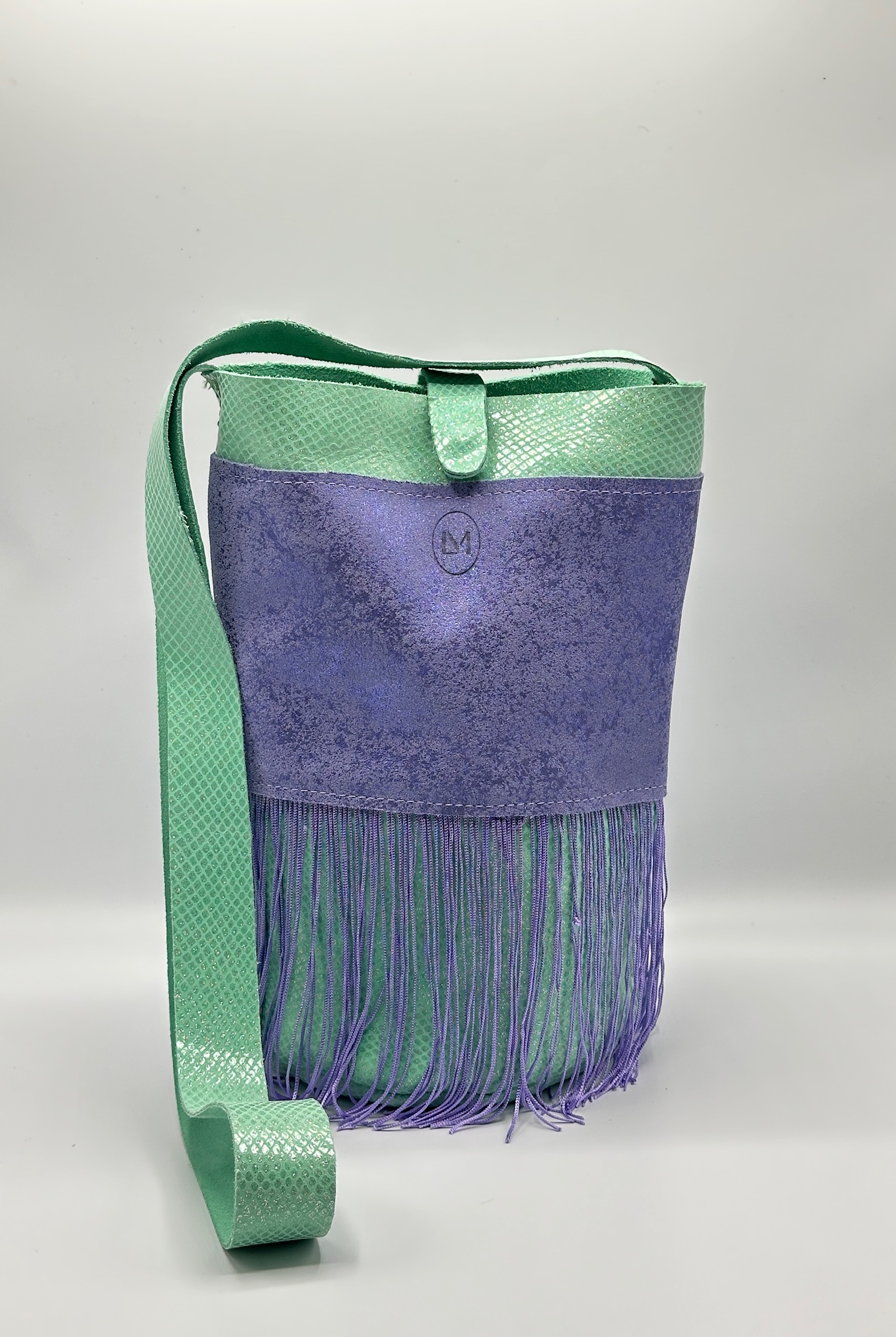 Su diseño destaca por la combinación del verde menta en la parte superior con un cuerpo en tono lavanda, creando un contraste armónico y vibrante inspirado en los matices de las auroras boreales. Los flecos aportan dinamismo, movimiento y un toque original que no pasa desapercibido.