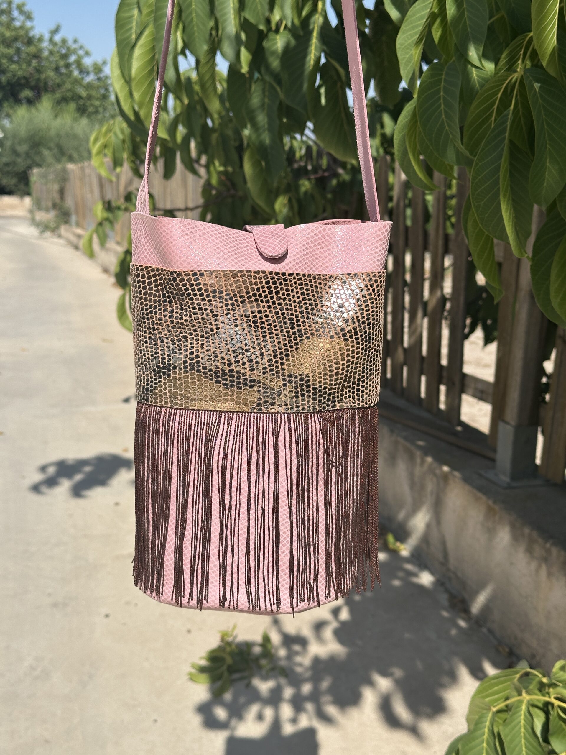 Bandolera rosa hecha a mano en piel natural, con flecos y textura serpiente. Un bolso único que combina elegancia, comodidad y diseño artesanal.