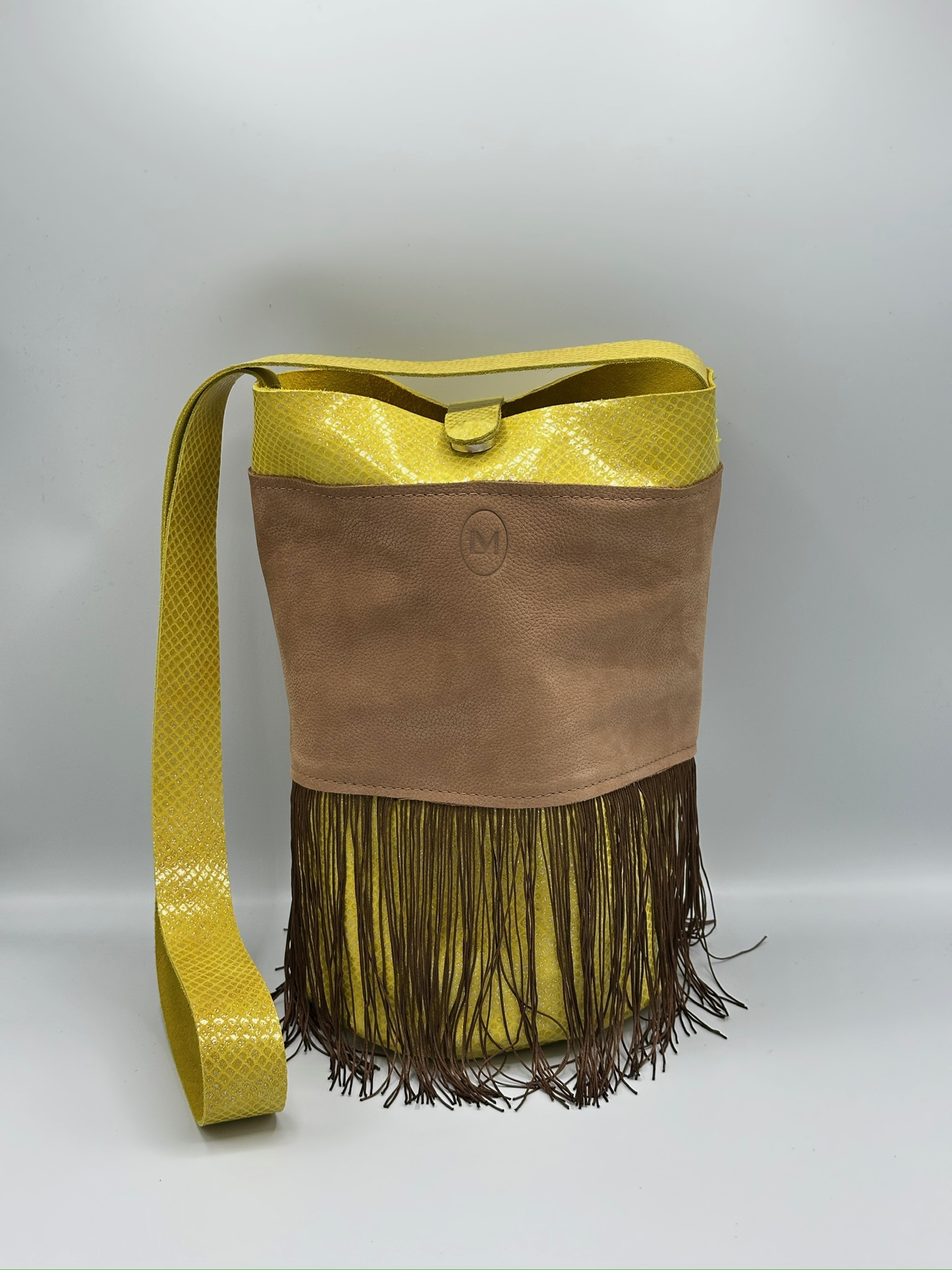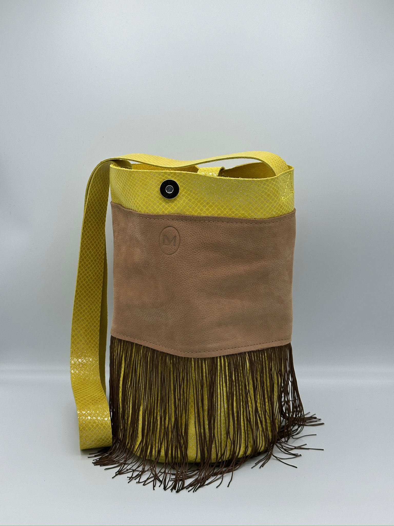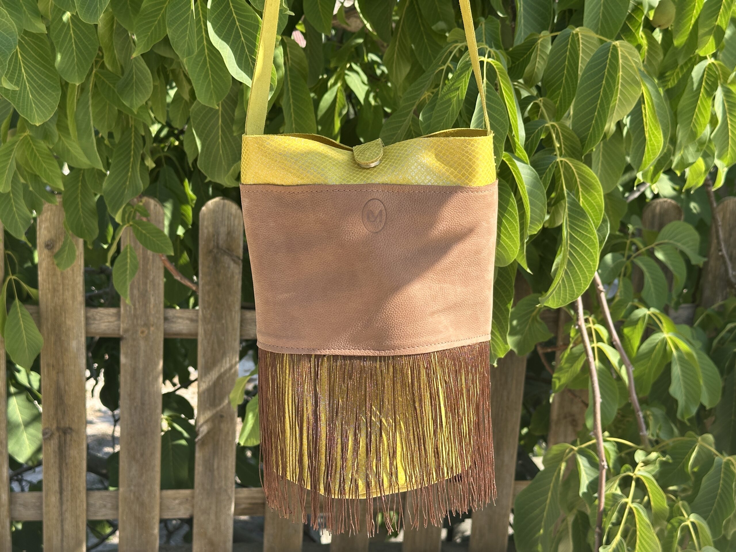 Bolso Sahara- Bandolera artesanal en piel amarilla y ante marrón