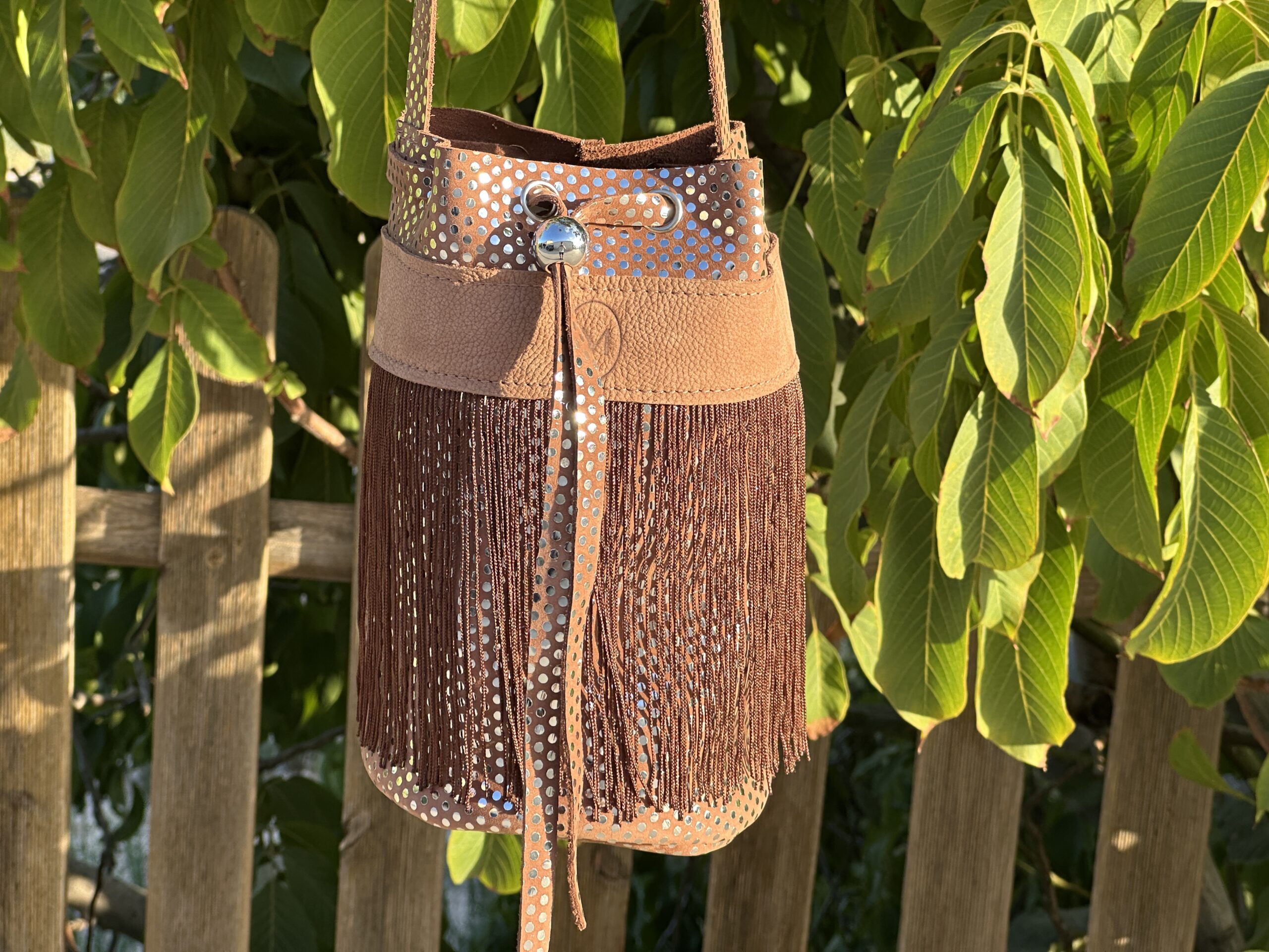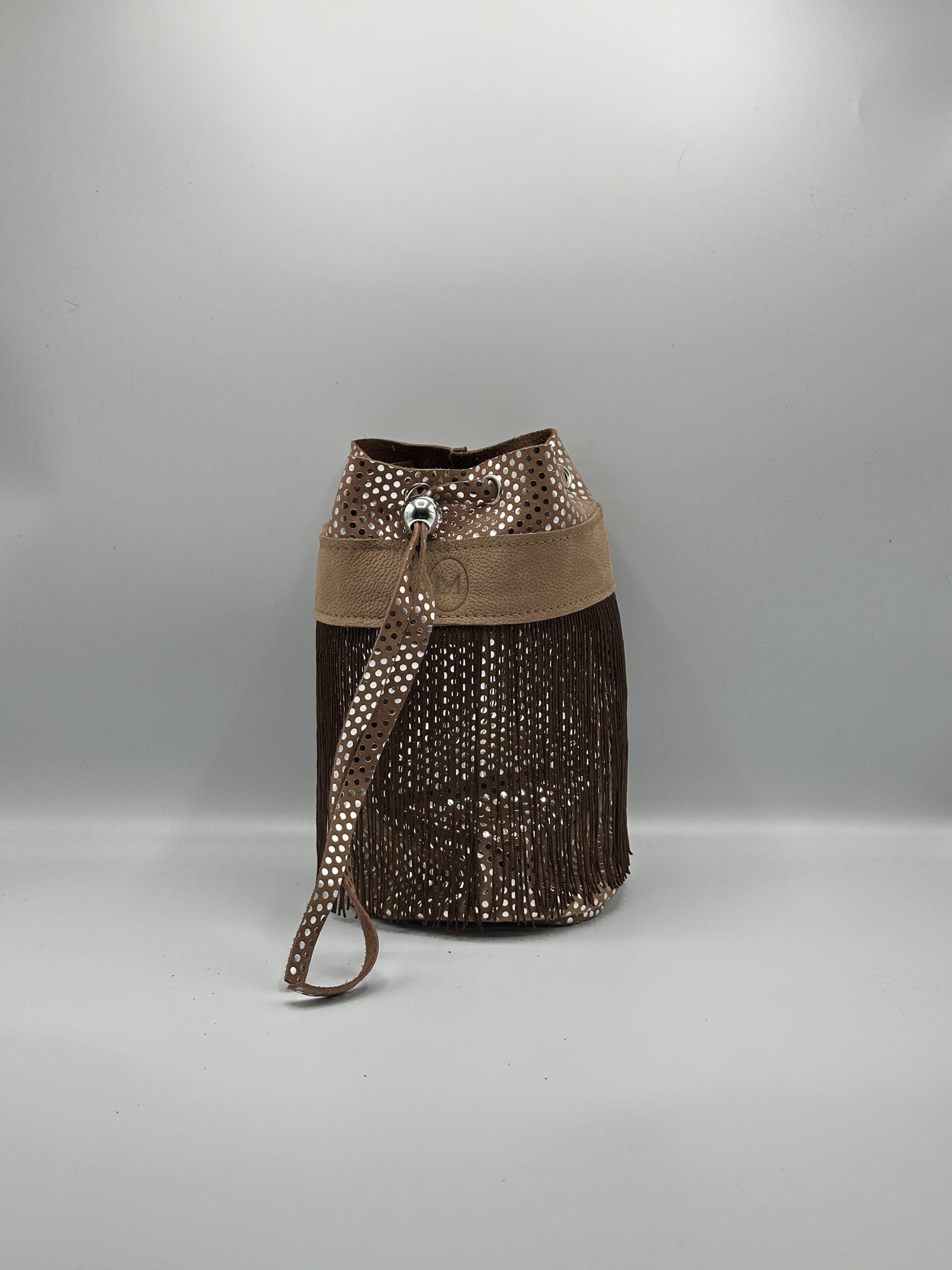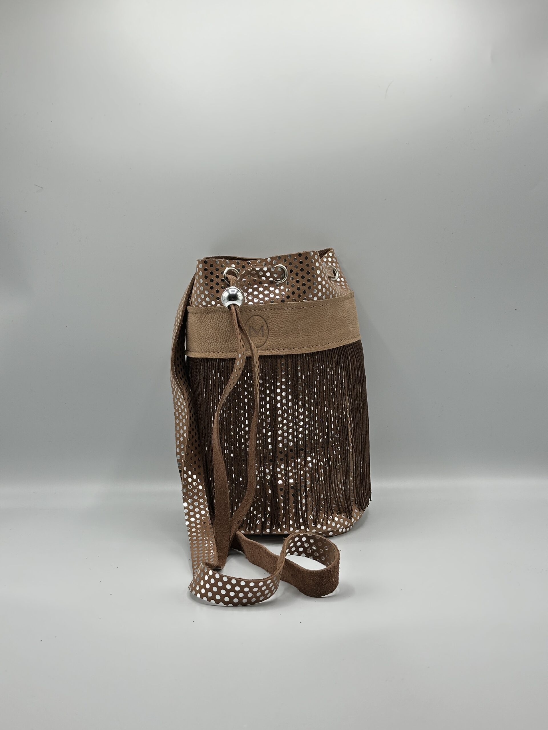 Bandolera Cordón Tierra – Bolso artesanal de piel perforada con flecos marrones